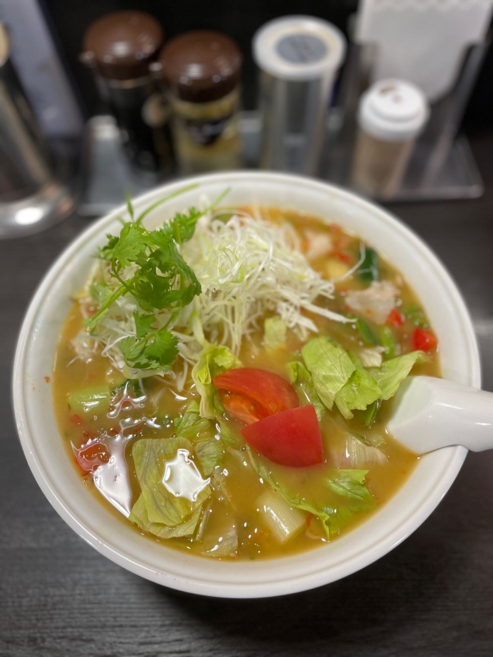 レタス•トマト•キュウリ•ねぎ等々青唐辛子がたっぷり入った、見た目はすっきり爽やかからの〜びっくり激辛麺🤣