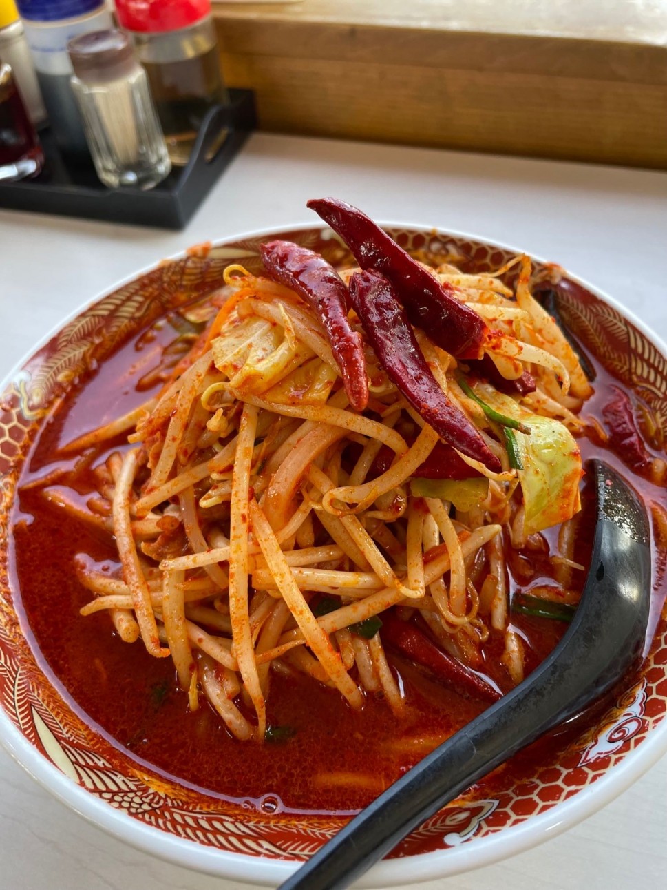 お店の方に聞くと麺は250gだそうです♪もやし・キャベツ・ニラ他、キクラゲが嬉しい野菜と🌶🌶🌶がたっぷりな一杯です🤗