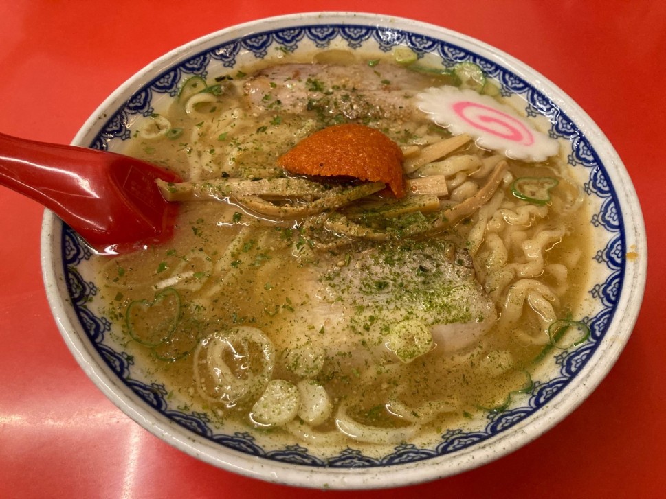 縮れ麺と甘味を感じる味噌スープが優しさを、ニンニクが力強さを加えています
