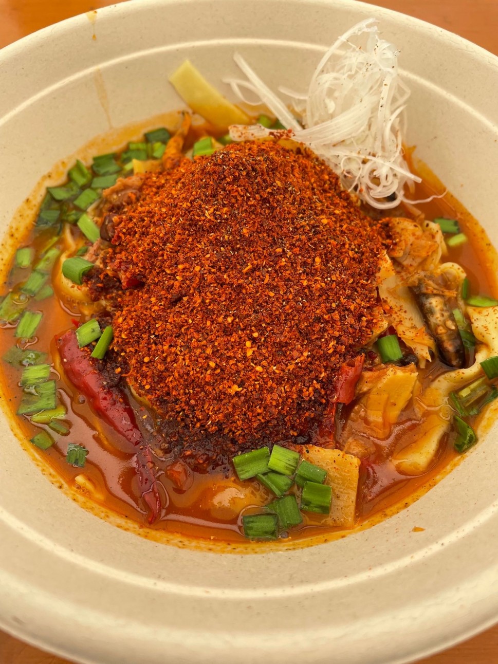 混ぜるとスープがペースト状に。口に入れるとまず苦味の方が際立っていた印象。その後にビリビリと辛さが来て、なかなか引かないタイプの辛さでした。麺はもちもちしていて美味しかったです!!