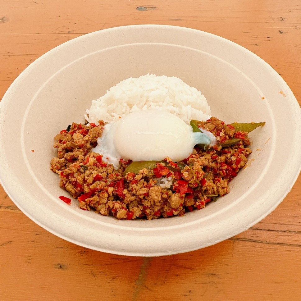 一口ごとのアタックは強いですが、ライスと卵が辛さを和らげており、美味しく食べられます。量もちょうどいいですね。
