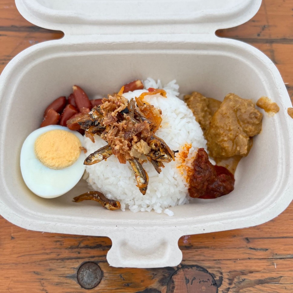 カレー味の鶏肉とアーモンド、煮干しをライスに盛りつける、僕は初めて目にするマレーシア料理ということです。辛味ペーストで辛さを調節していますが、最辛でもアジアらしいココナッツ風味が出ています。