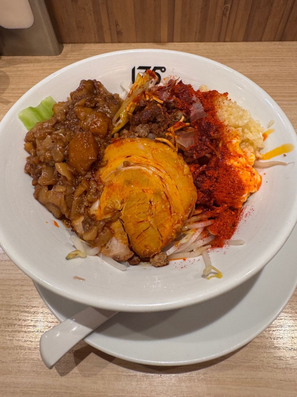 少し前に担々麺を食べた際にも辛さのレベルを全体的に落としているように感じられましたが、3年前に通常の一七五郎を食べた時からさらに辛さが落とされているように感じました(ちなみに通常一七五郎は私的ジャッジ3.25。今食べたらもっと低くなるのではないでしょうか)。激烈な辛さを求めて行くとどうしても物足りなさを感じますが、味自体はとても美味しいのでチャラといったところでしょうか。ジャンクを極めたビジュアルです。