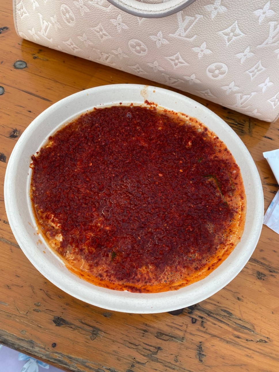 煉獄❤️🔥たっぷりの唐辛子と溶き卵さいこーに美味しい😭 スープ自体はそんなに辛くない、、、?🤔 麺食べ終わったあとに溶き卵と唐辛子だけ黙々と食べるのがすき‼️