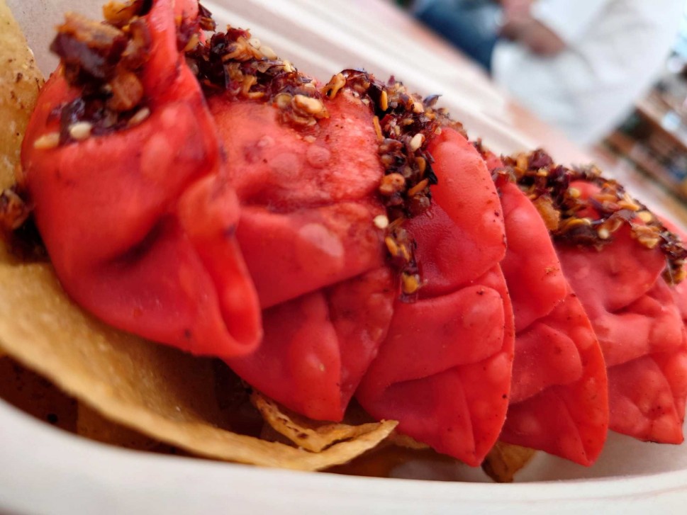 だって餃子が赤いんです。
