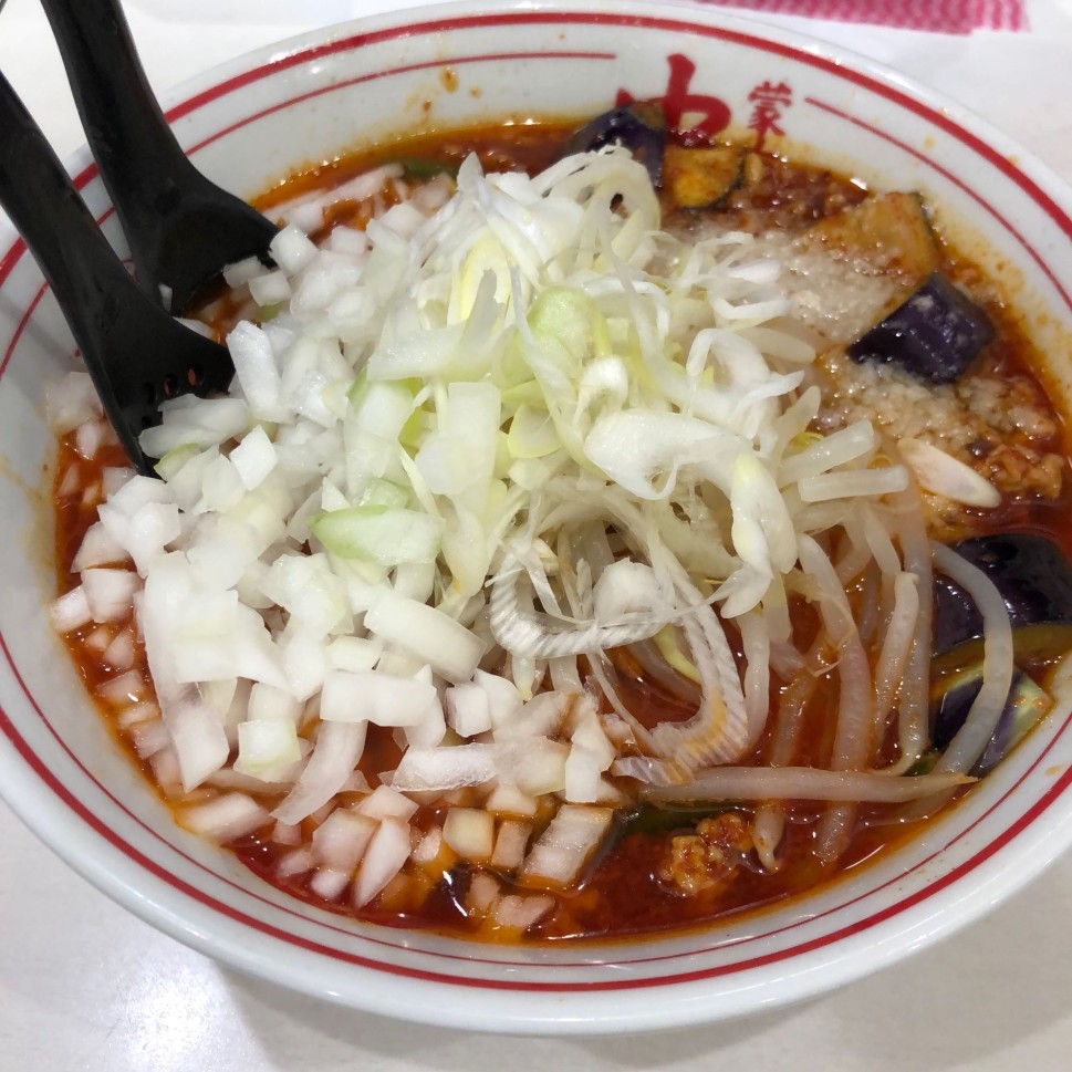 麺半分で刻み玉葱、背脂をトッピングしました。ひき肉と野菜の旨みがベストマッチで最後まで美味しかったです
