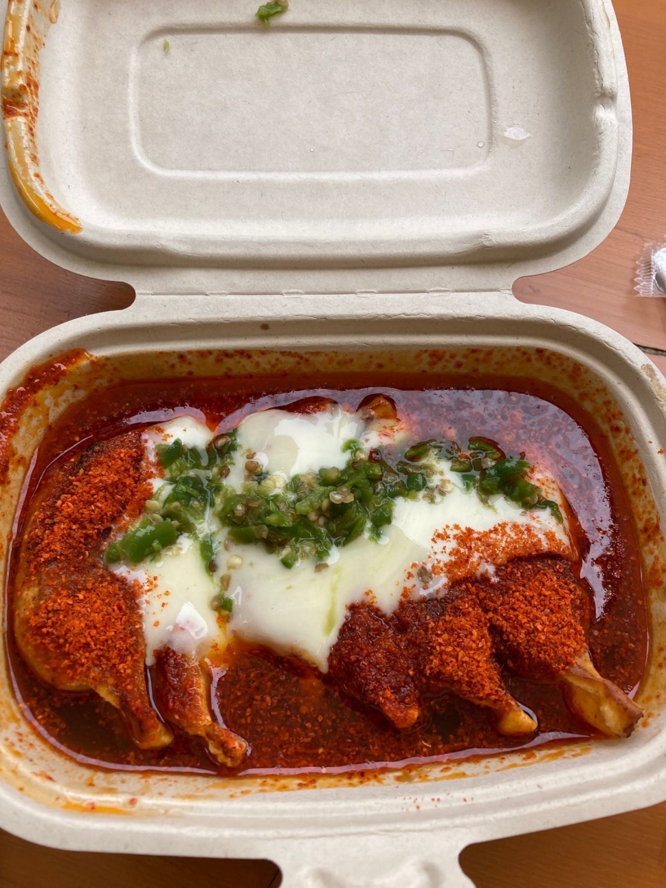 スープと上にのっている青とうがらしが辛い!餃子はそんなに辛くなかった気がします。旨辛くらい。もう1つ上(激辛だったかな)にするか迷ったけどちょうどよかった。おいしかったです!