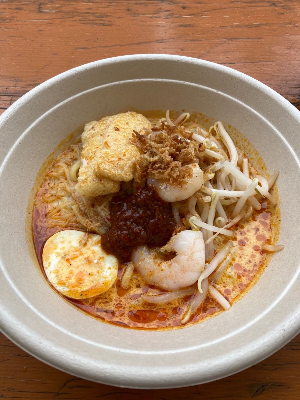 ビーフンメインかと思いきや2種類(多分ビーフンとスパゲッティ?)入っていて食べ応えあり!スープだけだと甘めですが、甲殻類系の味が強くておいしかったです。上にのっている味噌のようなものを全部溶かさないで麺と味噌を絡めながら食べるのが適度に辛くてよかったです。