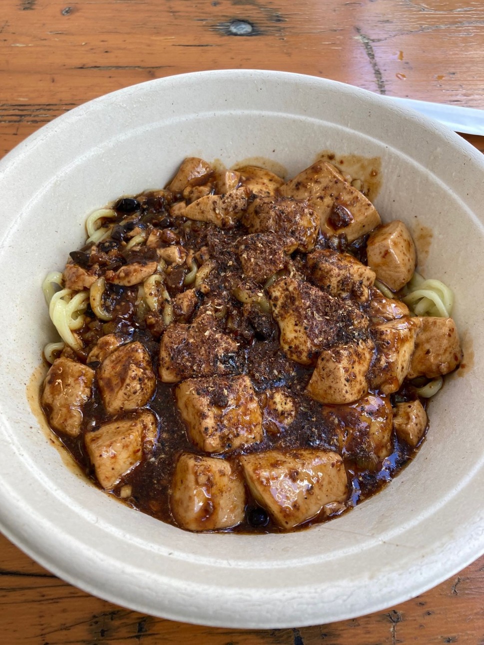 アツアツのお豆腐が辛い!けど、麺を混ぜながら食べるからか麻婆豆腐よりマイルドに感じました。黒い豆(トウチかな?)がたくさん入っていて、甘くておいしいです。食べ終わる頃には唇と喉が痺れてビリビリ!!