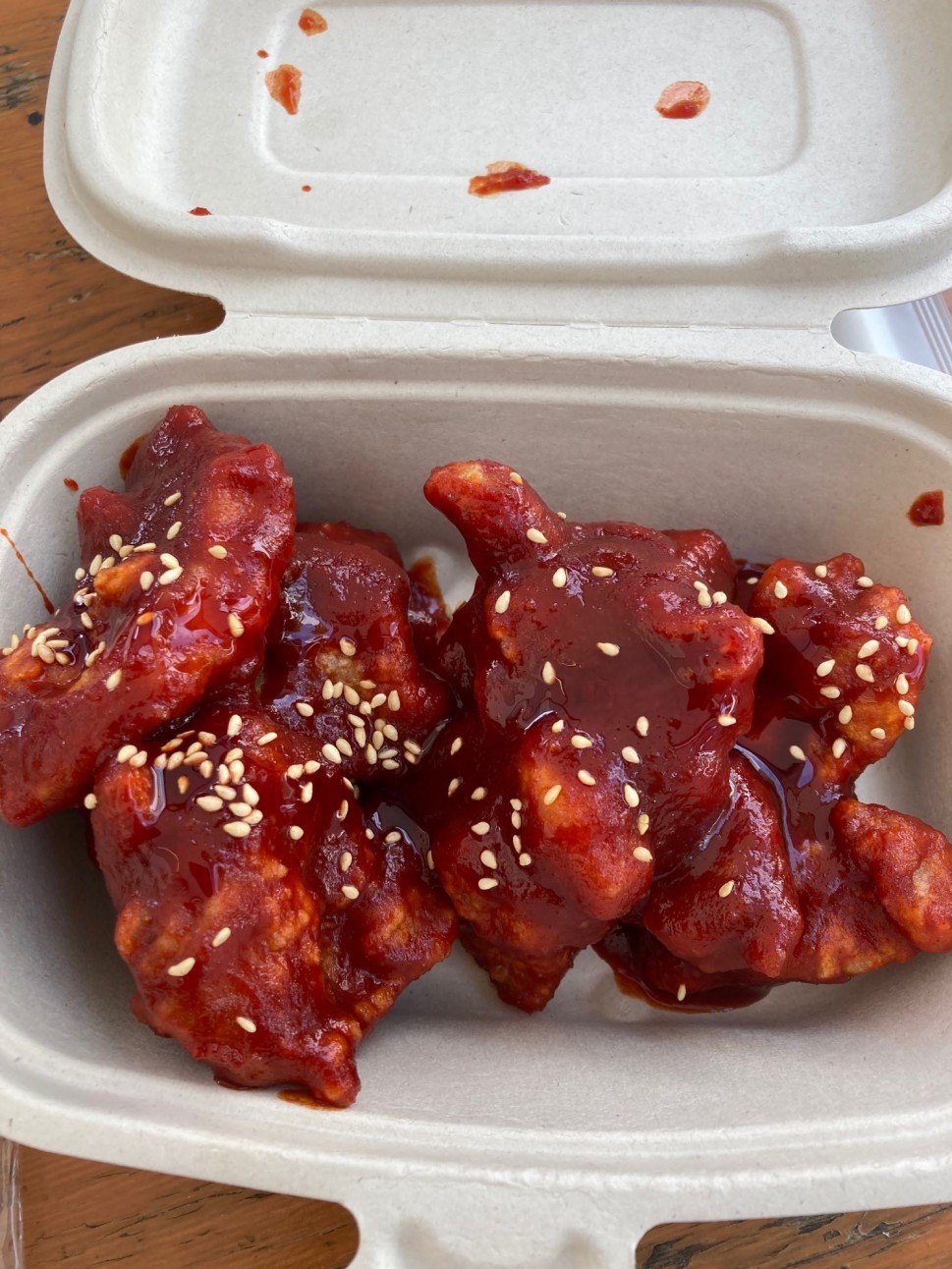 激辛と迷ったけど、おいしく食べたくて中辛にしました。濃いたれがたっぷりかかっていて甘辛でおいしかったです!特に皮が冷めててもカリカリで最高!もしまた機会があったら激辛挑戦したい〜!