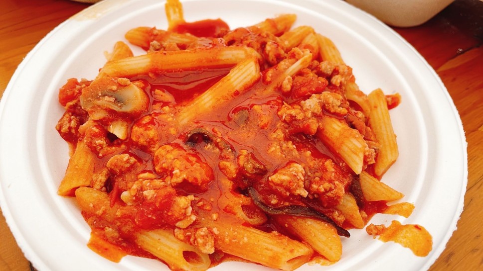 本日いただいた5品の中で1番おいしかったのが、こちらのペンネ!辛ソース系の辛さでしっかり辛さを感じますが、それ以上に挽肉ときのこ(マッシュルームとエリンギ)の食感と旨味が感じられておいしかったです。