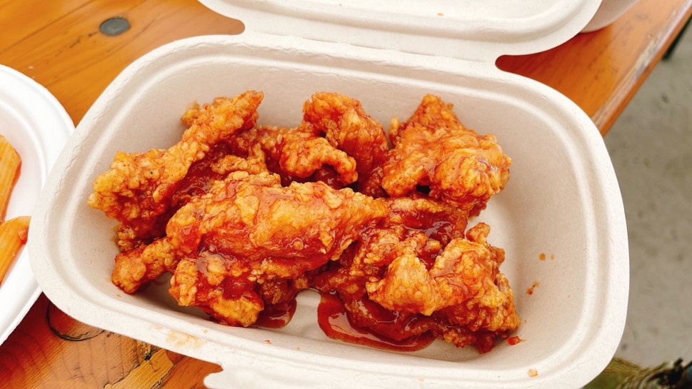おっきな唐揚げに甘辛なヤンニョムソースが絡んでいて、ビールのお供に最適でした!ピリ辛くらいなので、後半の激辛メニューを食べてる頃には箸休めとしても活躍してくれました。