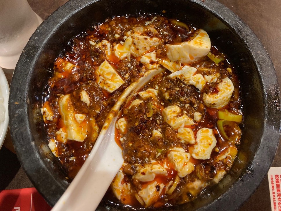 中辛をいただきました。石焼きの中でぐつぐつ音を立てる麻婆豆腐、香りと見ためだけでおいしそう。山椒と複雑なスパイスの辛さがありましたが、想像よりは辛くなく若干薄味に感じました。
