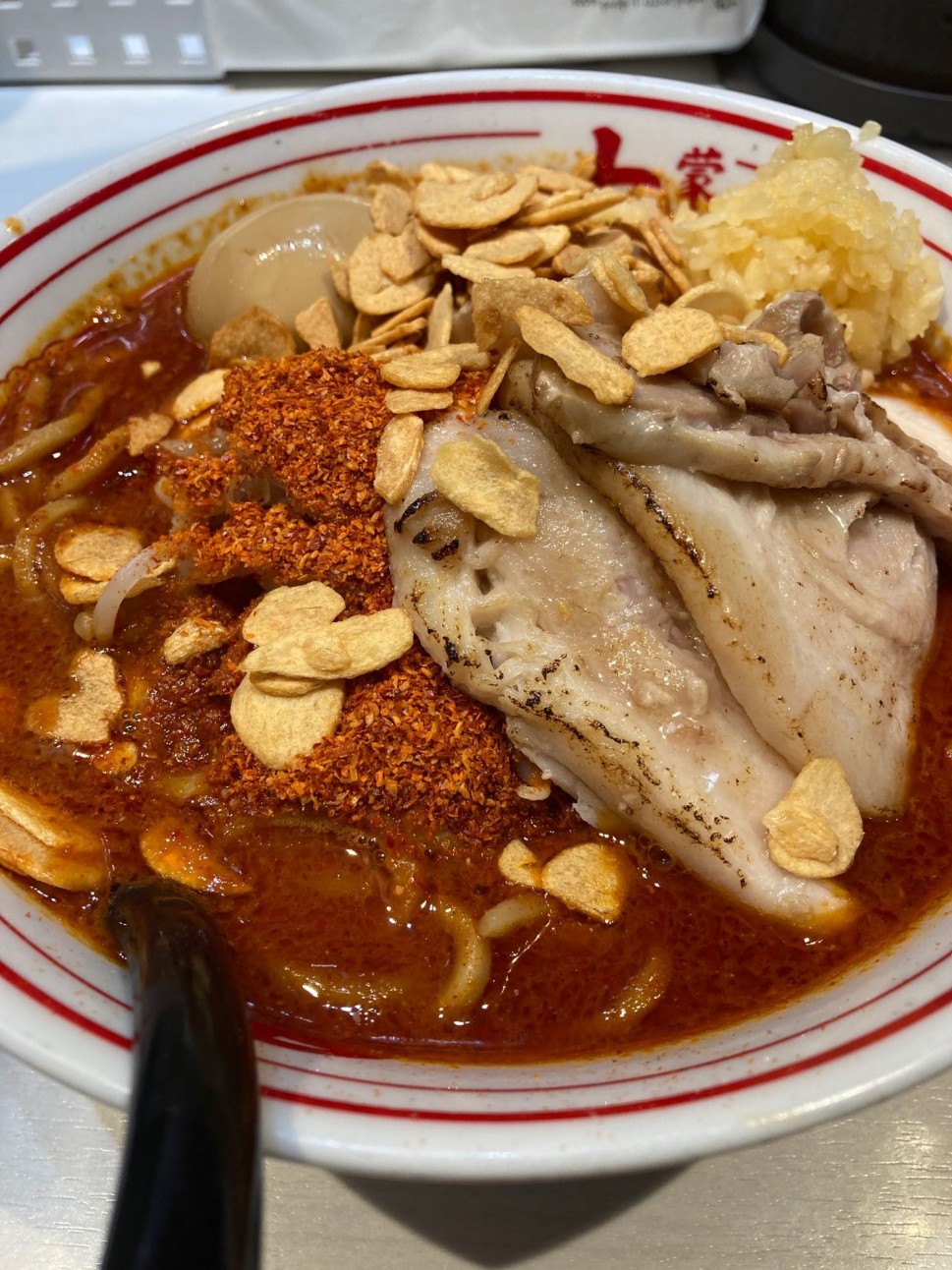 限定メニューの復刻版。北極をベースにさらに唐辛子、ニンニクが入っています。チャーシューも柔らかい。個人的な感想は、唐辛子の苦味や舌触りが先行してしまい、スープを追加しておけば良かったかなと。