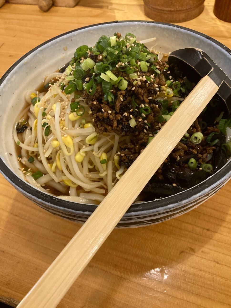 辛さはほどほどですが、しっかり身体が暖まります。冷やしを食べましたが、上に乗っている野菜などは温かいです。シンプルでも美味しいうどんです。
