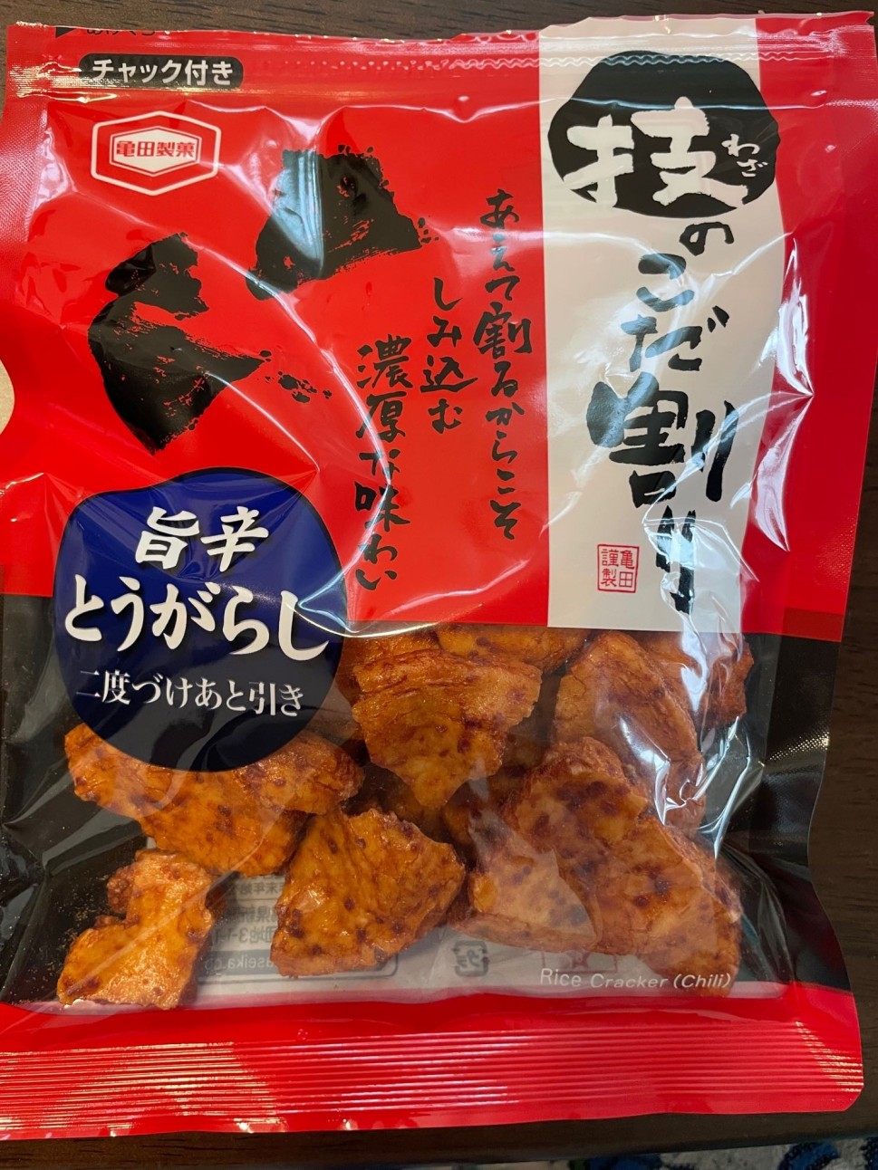 辛さは全然ですが、このせんべいは普通のしょうゆ味も美味しいです。中まで味が染みててビールのお供にぴったりです。