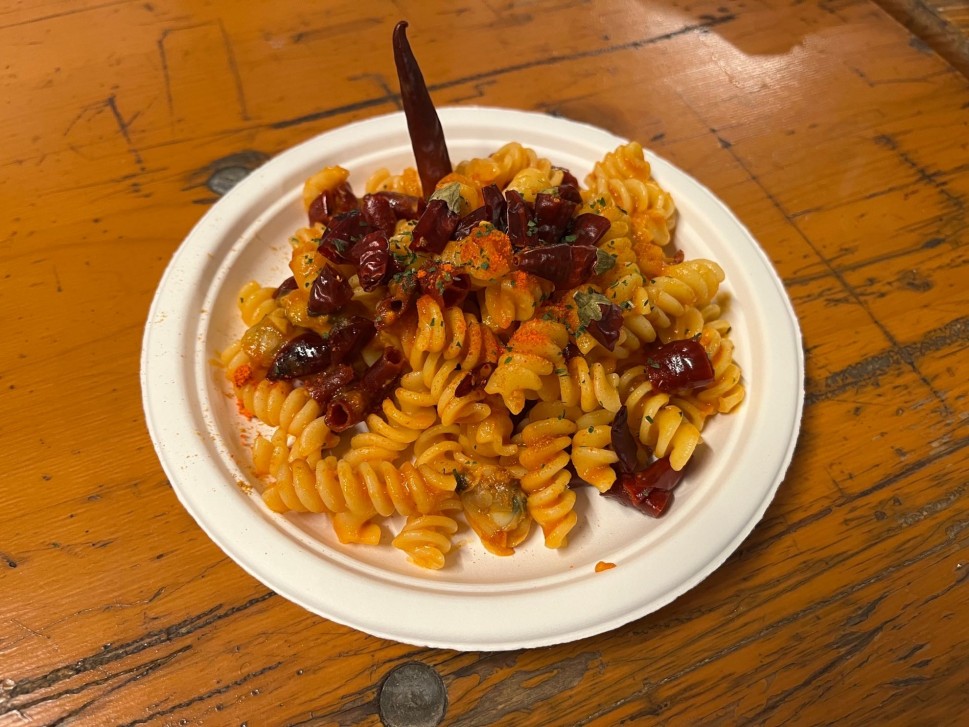 上に赤唐辛子が結構かかっていて、一緒に食べるとピリッと辛かったです。