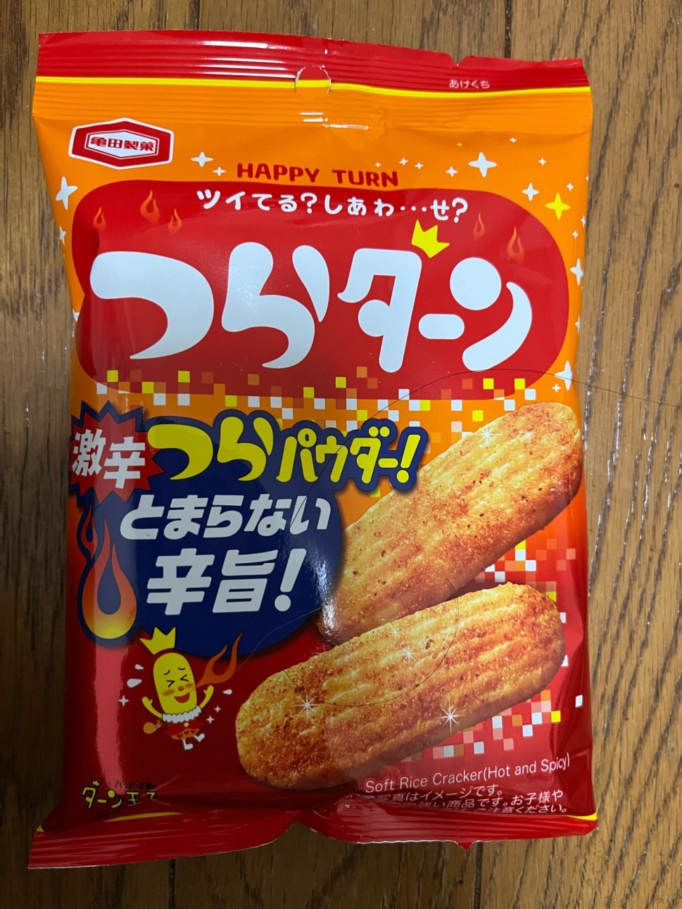 エイプリルフールの日に亀田製菓からでたつらターン!ハッピーターンの甘みもあって、美味かった。リピ買いしたい。私にはそこまで辛くなかったけど、辛味がバグっているので参考程度に。苦手な人には辛いかも?