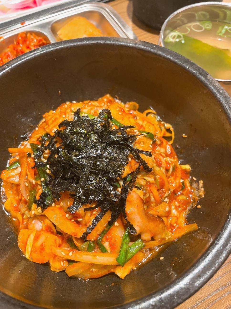 タコとサムギョプサルが入った辛いビビンバ。全体的にコチュジャンの味がして旨辛〜!普通に美味しかったです!辛ラーメンよりほんの少し辛いくらいかな、辛いの苦手な人は無理そうだけど得意な人からすると物足りない感じ、、でも美味しく食べれる辛さなのである意味ちょうどいいかも!