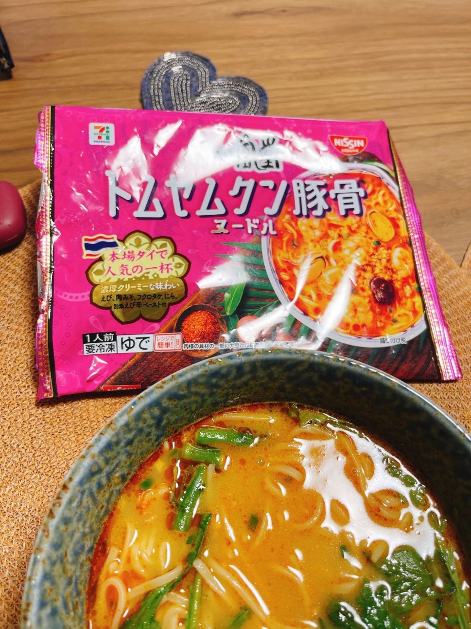 セブンイレブンにて販売中の一風堂トムヤムクン豚骨!チンするだけ!生麺感が美味しかった😋辛さはピリッとくらいですが、トムヤムクン好きには良い味。豚骨だからまろやかさが増してるのかも。