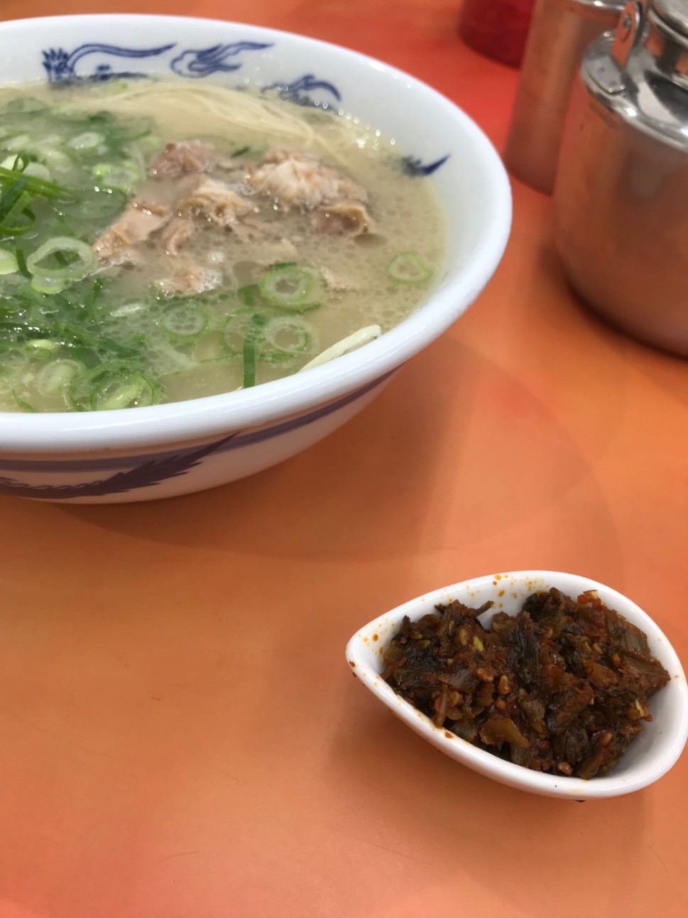 福岡で最も好きなラーメン屋さん私は長浜の「家」推しです毎度「ちょいベタナマ」でオーダーします「鬼からし」は辛子高菜で、替え玉する時に投入しています。他のラーメン屋さんの卓上辛子高菜と比べて、結構辛めです。