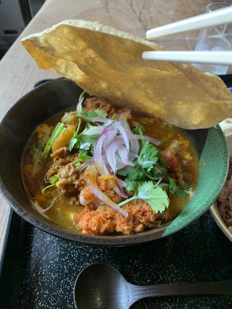 まず驚いたのはカレーうどんの上にパパドが覆いかぶさっていたこと。(写真は箸でめくったところ)