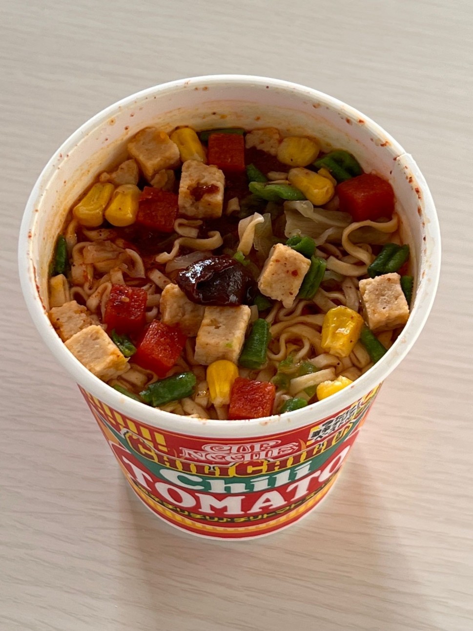 カップヌードルチリトマトベースということで安定の美味しさ!ただ、ペースト全部入れたとしても激辛好きとしてはまだまだ辛味がほしいところ、、今後の更なる挑戦に期待✨
