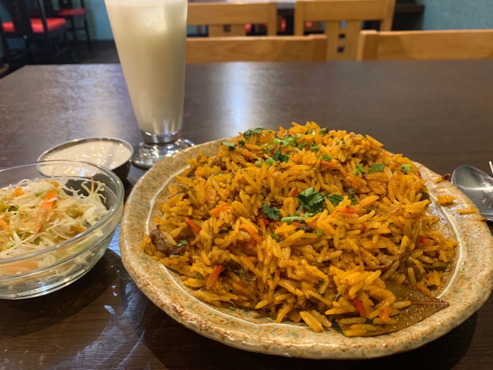 カレーがメインのお店ですが、マトンビリヤニとチキンビリヤニが隠れた逸品。辛さは塩コショウのスパイシーさで、かなりのポリューム。