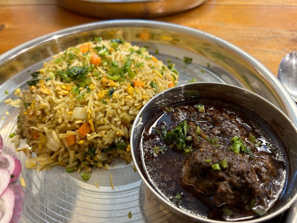 現在インドで流行しているインドチャイニーズを形にした「サオジフライドライス」は、普段のオイリーなサオジカレーに加え、シェズワンチャトニなどさらに辛さが加わっており、店主も心配の声をかけてくれます。