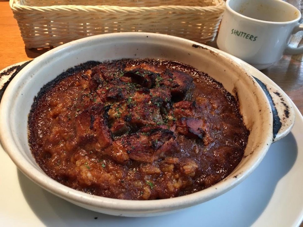 焼きカレーセットはランチタイムに現れるメニューで、ピリッとした辛味と濃厚な味わいが楽しめる一皿。サラダやスープもついてきます。