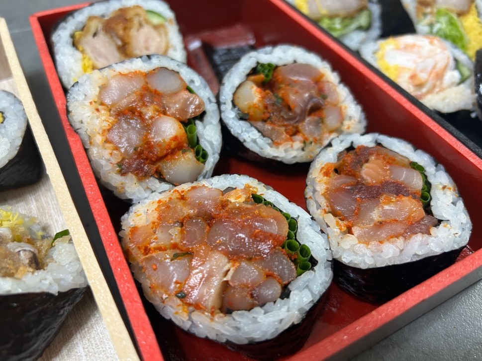 「エビ巻」に並ぶ同店の人気巻き寿司が「地獄巻」。新鮮な魚が唐辛子でコーティングされたお寿司ですが、その名の通り、ピリ辛どころか地獄のようにとにかくビリビリと辛い!辛いもの好きな方もかなり満足してもらえるはず。