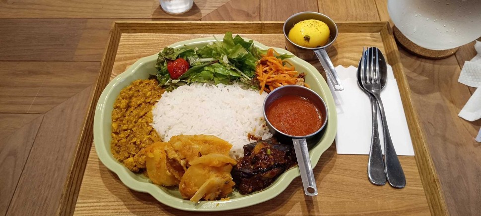 恵比寿にある小洒落たカレー屋さん。ライスをジャスミンライスか雑穀米から選んで、副菜なども店頭の数種類から選んでプレートにする。今回の副菜は麻婆茄子とカレー肉じゃがなど辛味のあるものをチョイス。後は味変スープが付いてくる。全体的にスパイスは感じるけど辛さは控えめでヘルシーなカレー。