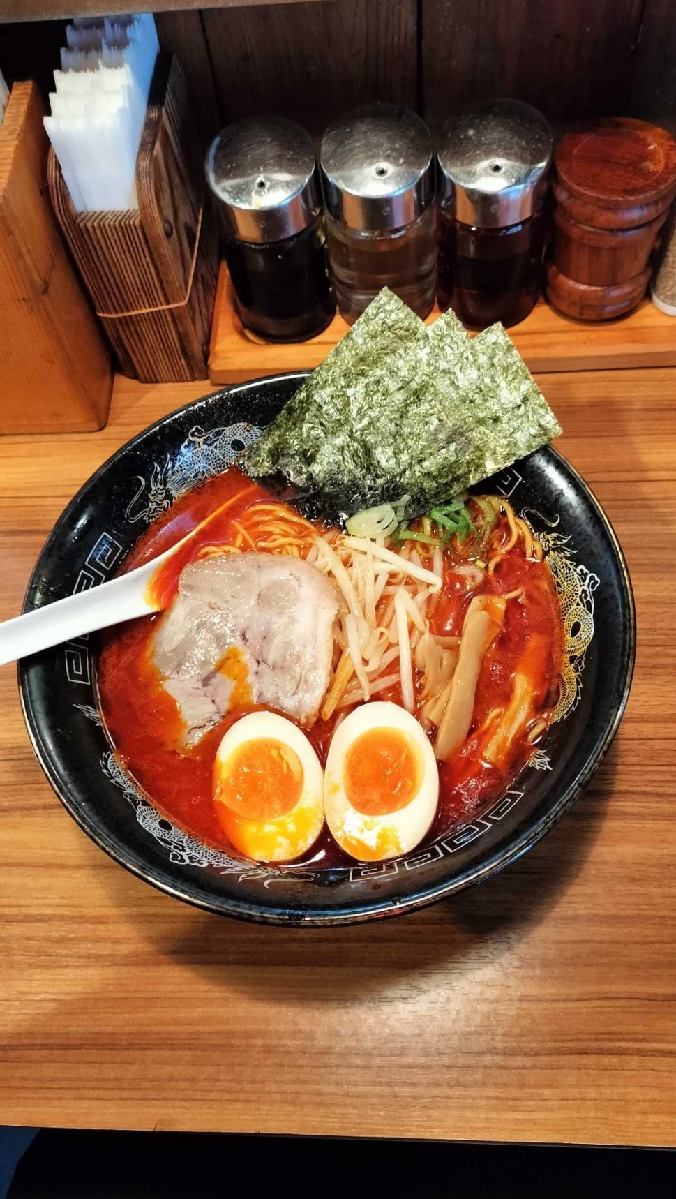 渋谷の金伝丸に伺いました。この通りはラーメン屋が多いのでいつもどこに入るか迷います。麺は細麺、太麺選べます。豚骨ベースでシンプルに唐辛子と辣油の辛さですが辛ラーメンより辛くない程度。チャーシュー、海苔、玉子が入っていて美味しいラーメンです。