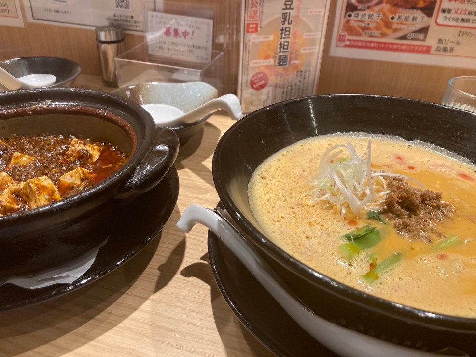 坦々麺と麻婆豆腐。とっても美味しいです。麻婆豆腐の方が辛めですが、激辛ではないです。でも濃厚で好きなお店です。