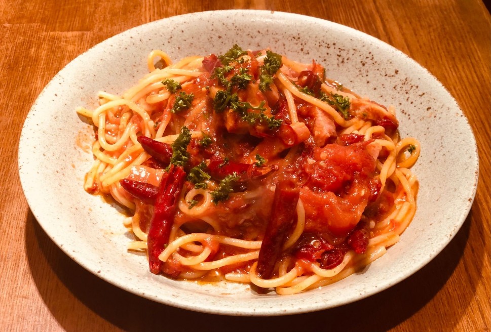 しかし、激辛の奥からさらにパワーアップしたトマトとベーコンの旨みがジュワッと出てきて、フォークが止まりません。パスタのもちもち感とベーコンの食感も最高です。