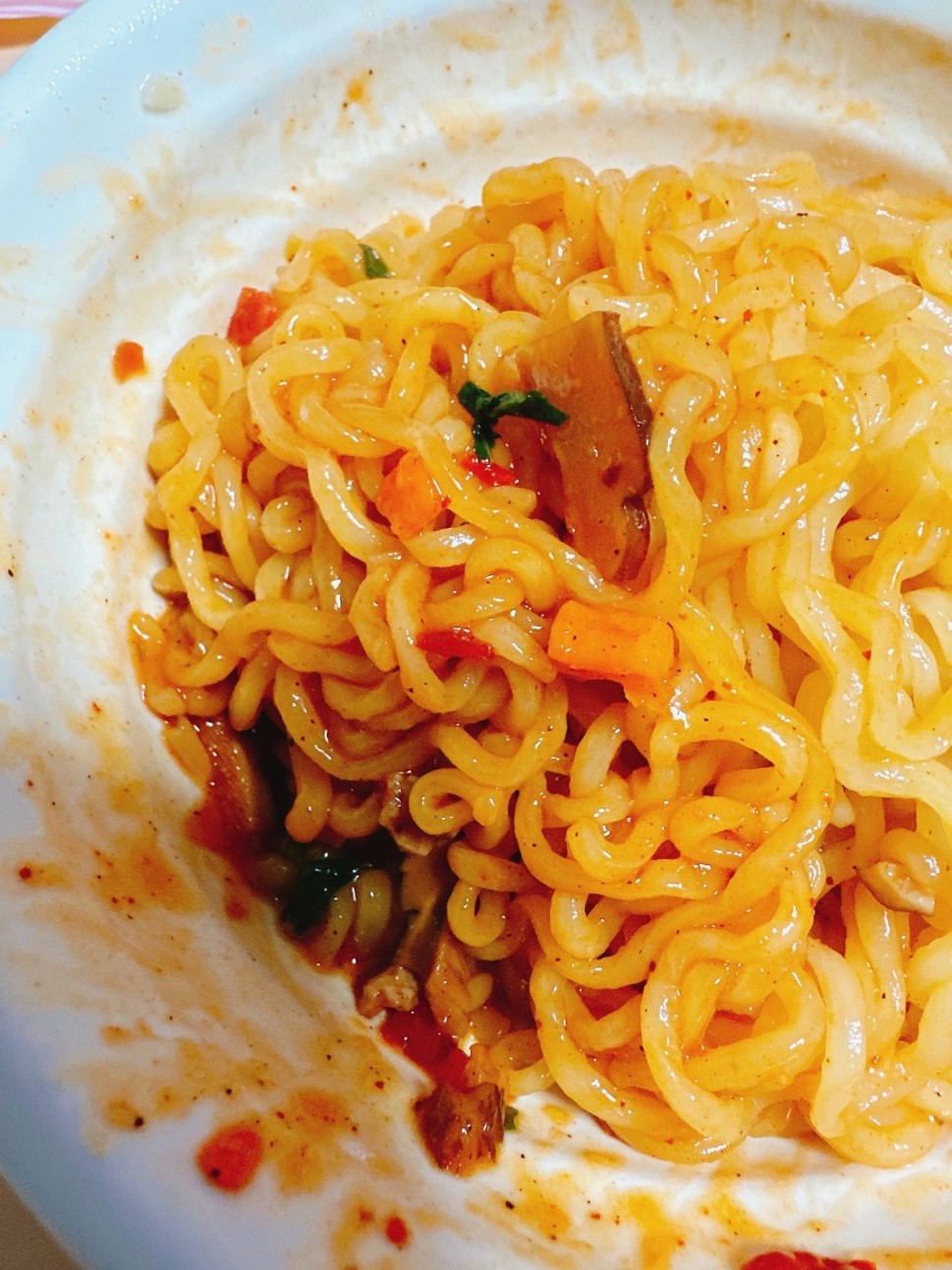 茹でたらゆで汁を捨てて粉末スープをかけてまぜまぜ。汁なし辛ラーメンの完成です。