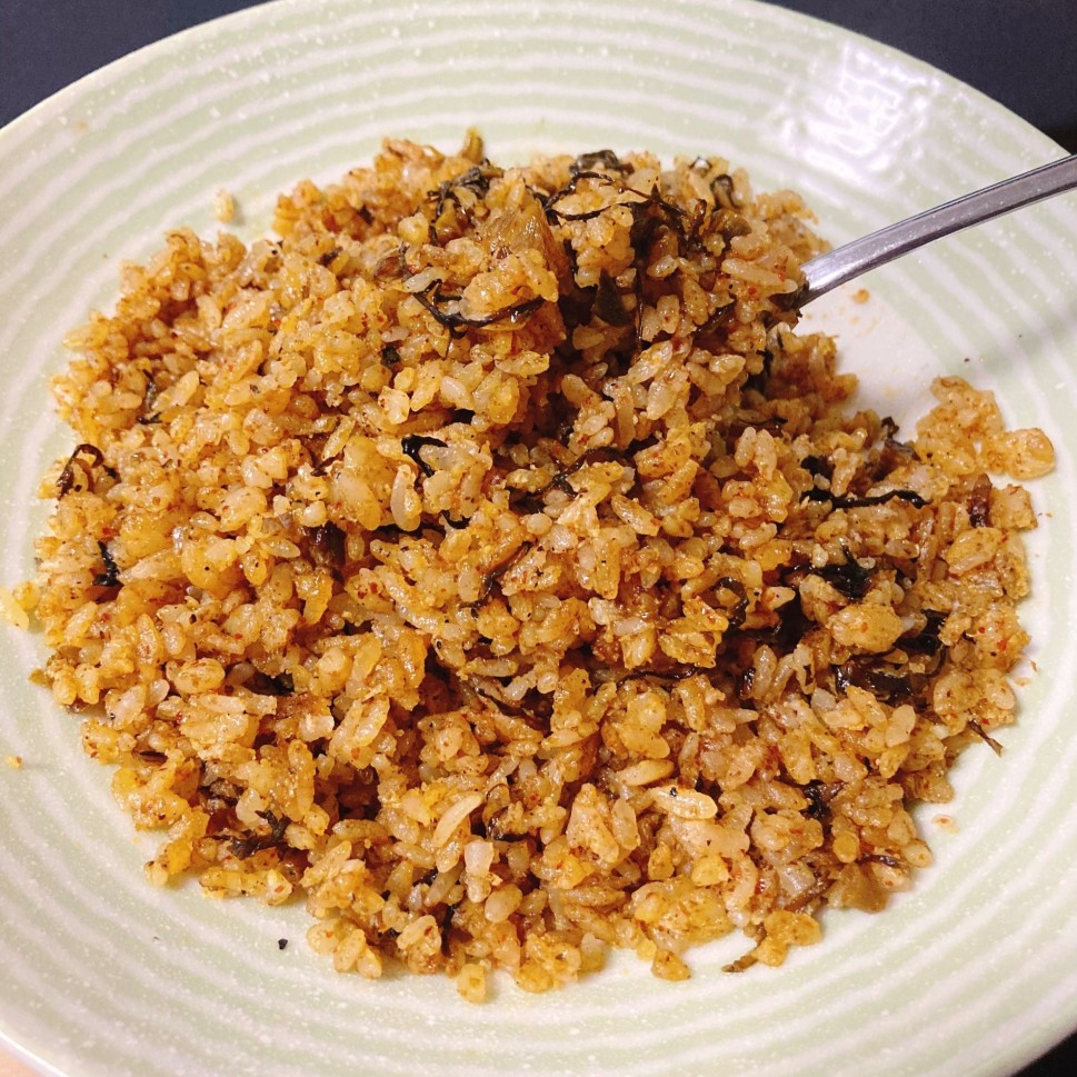 以前テイクアウトした辛子高菜を使い、高菜チャーハン作ってみました。冷やご飯に卵・マヨネーズ・味覇も加えてますが、辛子高菜の辛さは健在!熱々のうちに夢中で食べたら唇ちょっと腫れてました。。