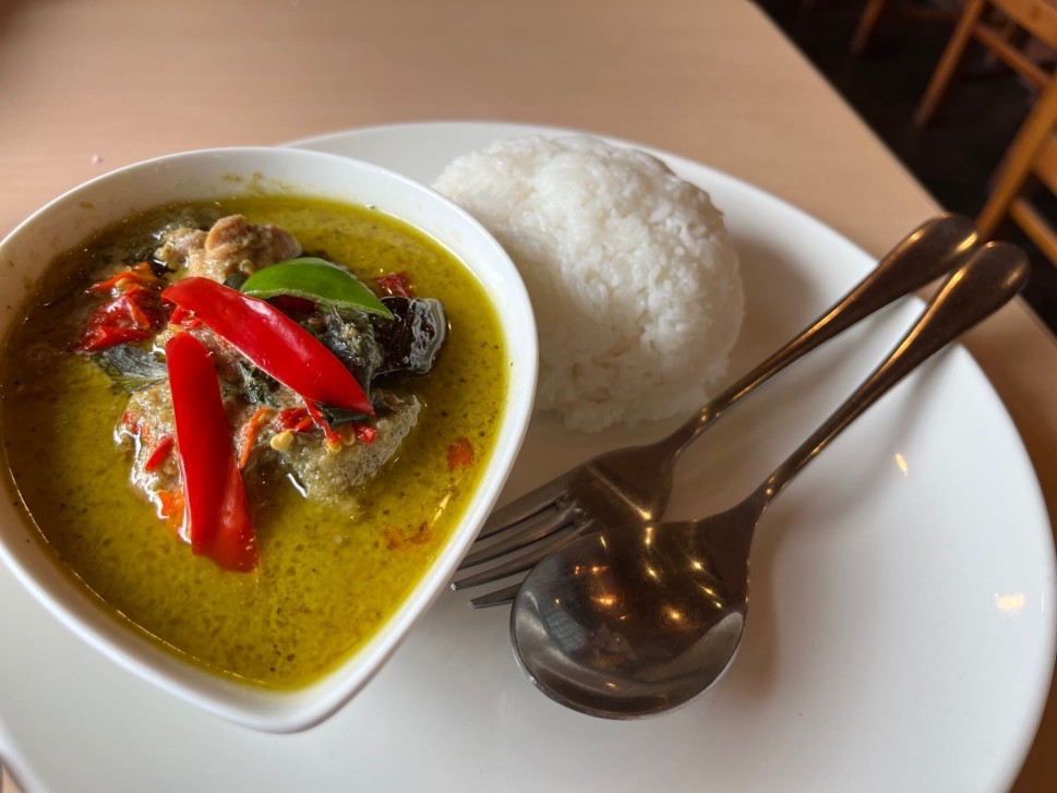 グリーンカレーは鶏肉と茄子がゴロゴロ入っていてタイ米と良く合いました。