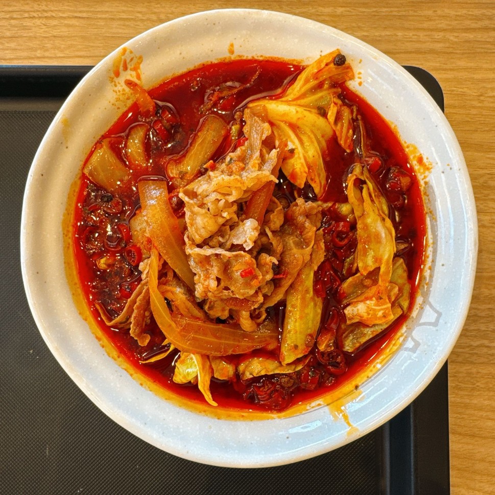 けっこう具沢山で、キャベツ、タマネギ、牛肉、花椒の粒がゴロゴロ、輪切り唐辛子ゴロゴロ♪