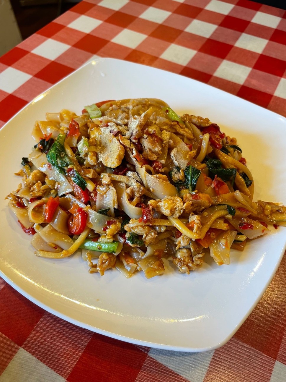タイの焼きそば。こちら店員さんに更に辛くして欲しいと伝えたところ快くOK👌元々の表記も唐辛子🌶️が5つ。お店の辛さレベルでは上位に違いない😆平打麺に豚挽肉と各野菜、パクチーなど唐辛子とナンプラー等の調味料で炒めてあり、めちゃくちゃ美味でした。辛さに強くないかたは辛さ弱めも頼めそうです〜是非ご賞味ください