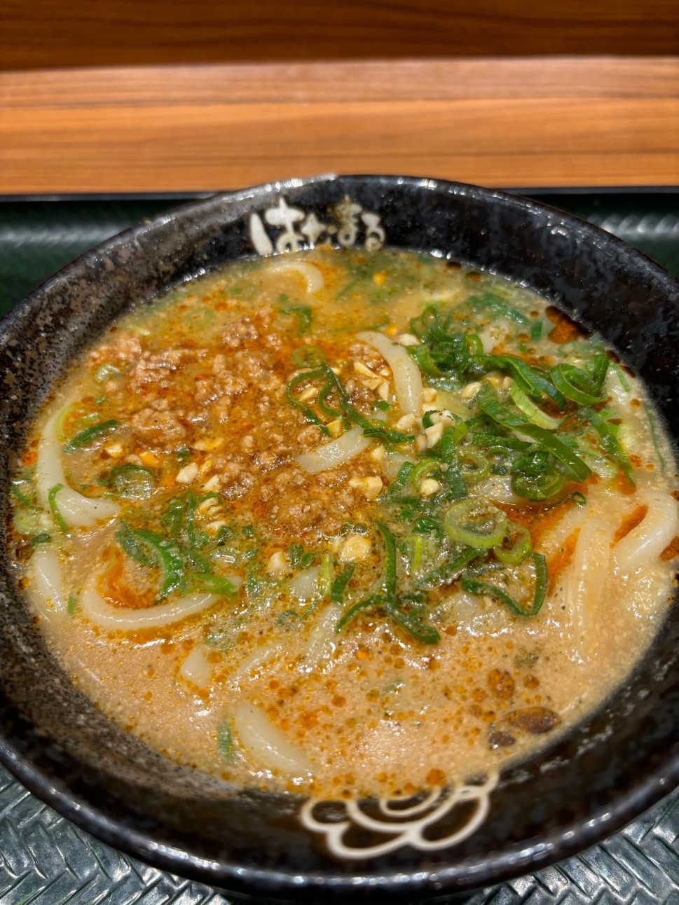 はなまるうどんに来ました🍜ピリ辛とのことで特別辛くはないですが、胡麻の風味と出汁がしっかりしていて、味はgood👌物足りなさはあるものの、クオリティは高いです✨ごちそうさまでした😋
