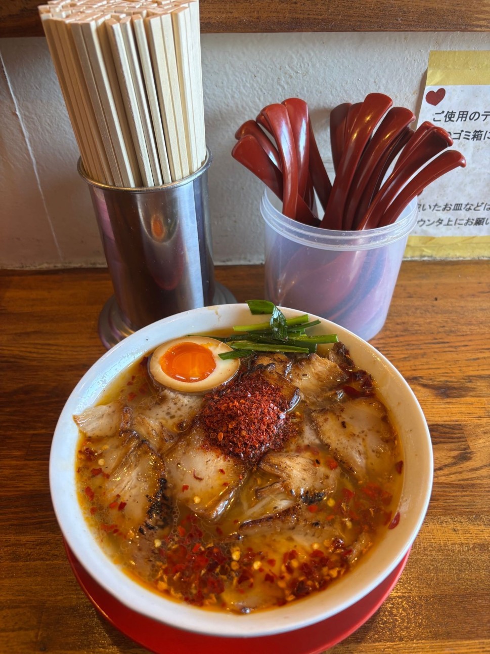 味はシンプルに豚でとったスープにあっさりした醤油コクで美味しい。麺はもちもちして食べやすい。辛さは弱い感じ🌶️刻み唐辛子やパウダー入ってるので美味しいですけど、ゲキカラドウの私には少し寂しいかなぁ😅