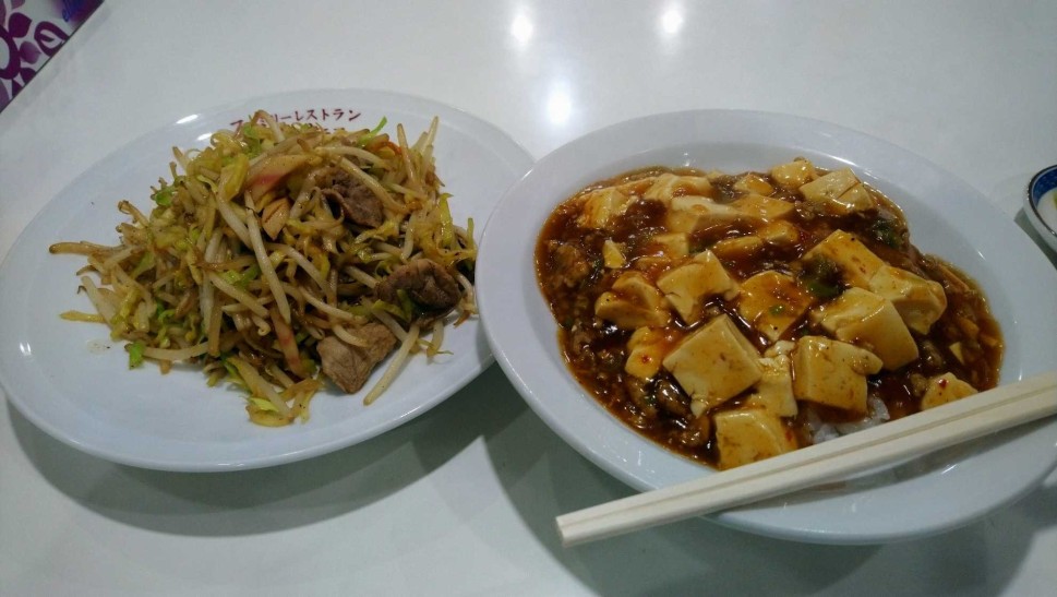 町中華のマーボー丼です。やさい炒めと一緒にいただきました。辛さ控えめでした。