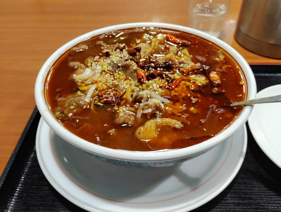 ラーメン丼になみなみと辛いスープ。スープと言うよりほぼラー油。具材は牛肉、野菜、キノコ、メンマ。お腹いっぱいになるので、具材だけ頂きました。