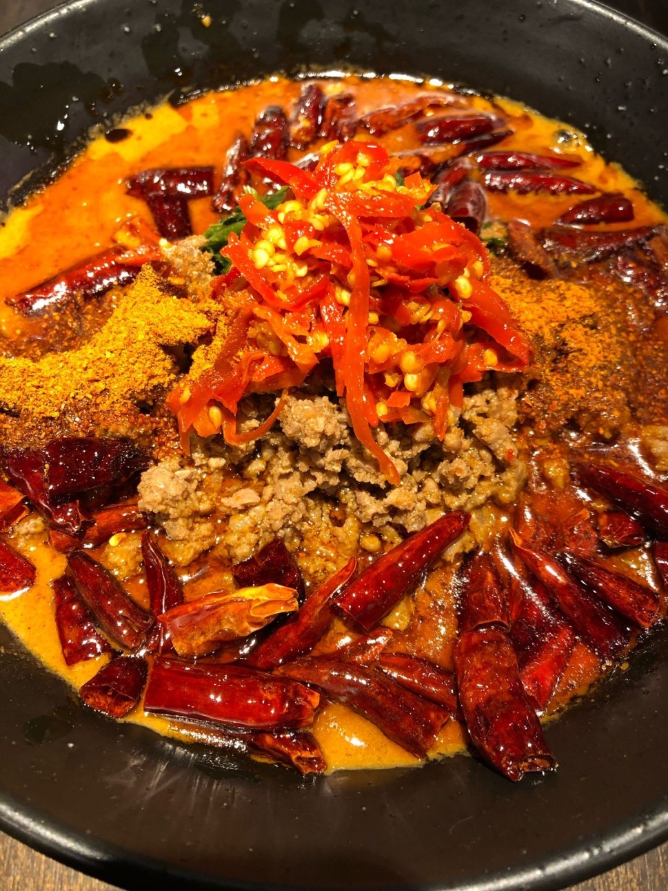 無限は2回目チャレンジですが、1回目は完食完飲後、夜になって死ぬかと思うほどの激しい胃痛に苦しみました。なんだか負けた気がして悔しくて再チャレンジすることに。ザクザクと食べる唐辛子。突き刺すような強烈な辛さと意識しなくともそれと分かる香りを放つブランド唐辛子。クリーミーでとてもまろやかなコクのある坦々スープ。旨みがジュワジュワ溢れ出るたっぷり挽肉。この美味さに騙されちゃうんですよね〜。今回は飲むヨーグルトを飲んでから万全の体制でチャレンジ。今回も美味しくいただき完食完飲。あ〜口の中が痛い。食後のケアにもう一度飲むヨーグルトをしっかり飲む。これで完璧だ。今回は完全勝利に違いない、と思っていたのですが、やはり夜になって激しい胃痛。1回目ほどではなかったにしろやはり、何とも言えない敗北感を味わうことに。恐るべし無限。MAXバージョンもあるらしいので、さらに精進してぜひチャレンジしたいと思います。