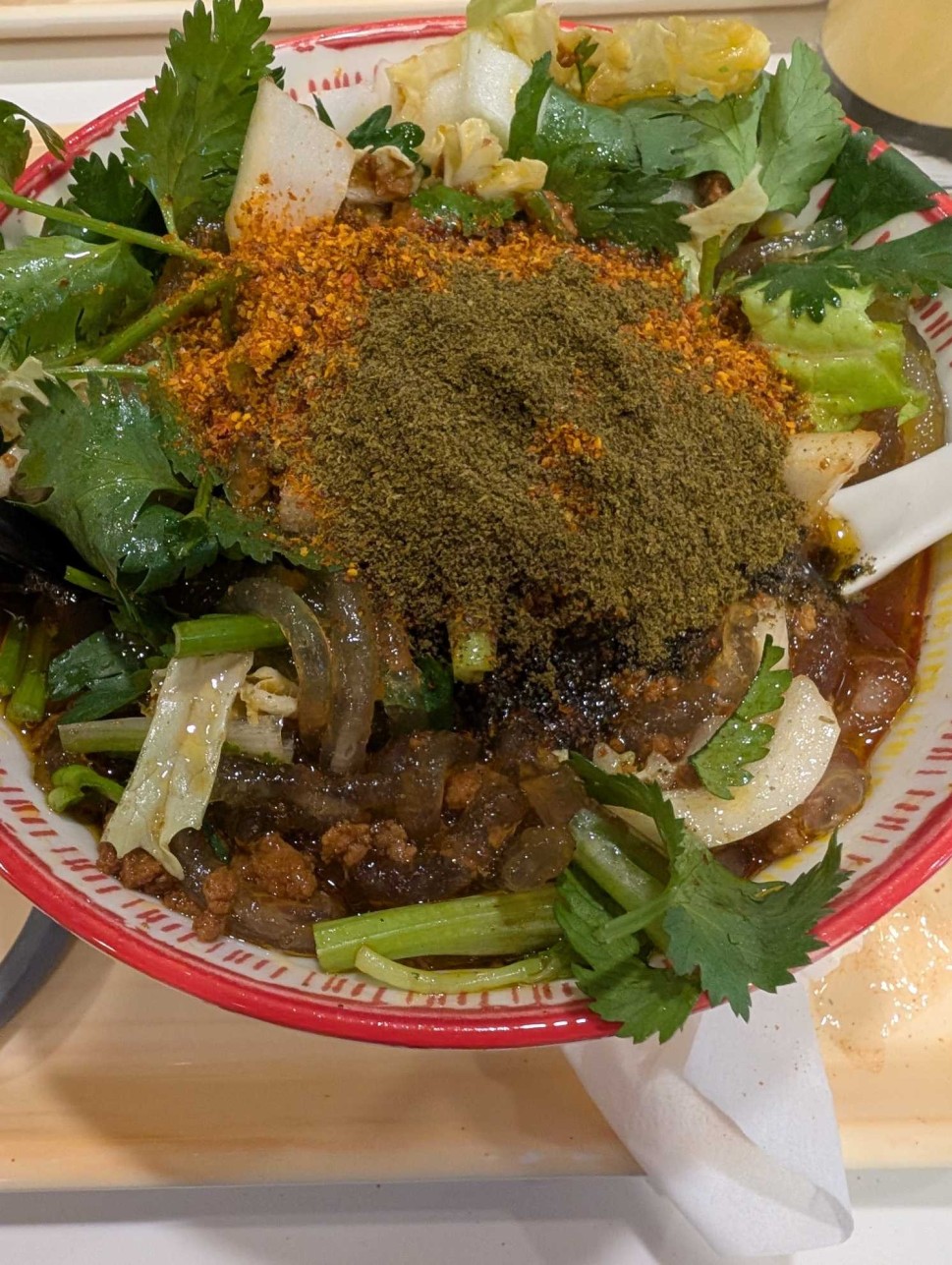 激辛 山椒と唐辛子が別パケでついてきます。パクチートッピングしました。山椒強いですね。酸を感じたければ卓上の黒酢を入れていくらでもアップできます。入っている白菜たまらない癒しでした。山椒がきいているので、唐辛子系とは異なる辛。最後の残り汁は結構強気な味。麺はシコシコで美味しかった。ヘルシーな気がするので、そこで旨さアップしている気がする。