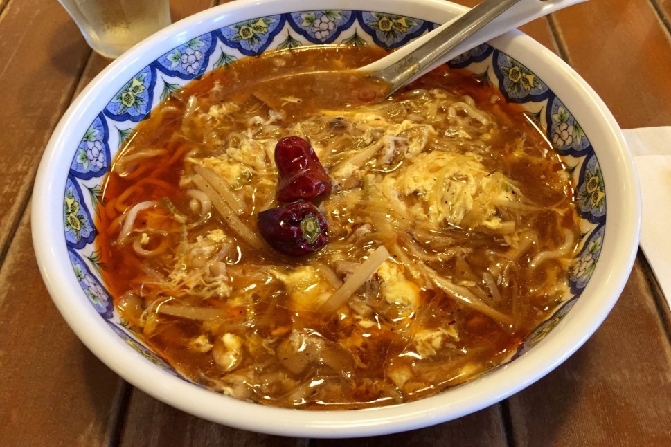 朝天唐辛子がビジュアル的に食欲を掻き立てます。 実際には甘い唐辛子なので、辛さを追求したい方はマイ唐辛子持参で追辛推奨。 スープの酸味、辛味のバランスは良い。