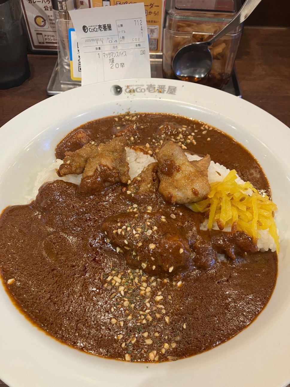 期間限定のマッサマンカレーはスパイス風味豊かで、なかなか美味しく頂きました。さすがに20辛は手強く、ココイチでは初めて"辛っ!"と感じられるカレーでした。ドロドロのソースとの配分を考えると、ご飯大盛り350gは少々余計でした(300gがあれば良いのに...)。