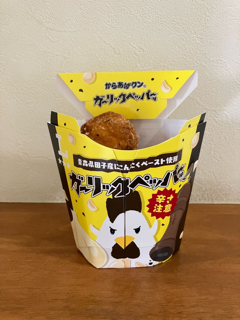 青森県田子産にんにくペーストとローストガーリックオイル、ペッパーオイルが"強いにんにく風味"と"優しいスパイス感"を作り出していました。辛さは無いものの、酒に合わせてとても😋なからあげクンでした。