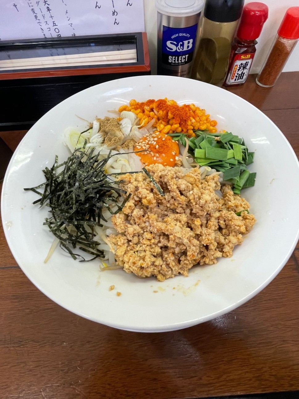 前回こちらで台湾まぜそば大辛を食べて辛さはそこそこだけどおいしい台湾まぜそばだった記憶があり再訪。前回は大辛でしたので今回は激辛を注文しました。メニューに大辛以上はトリニダード・スコーピオンを使用しているとの注意書きがありました。食べてみての感想ですが、辛いのですがトリニダード・スコーピオン単体が辛い感じで台湾まぜそばとうまく調和していない感じがします。台湾まぜそば自体はやはり美味しいです。